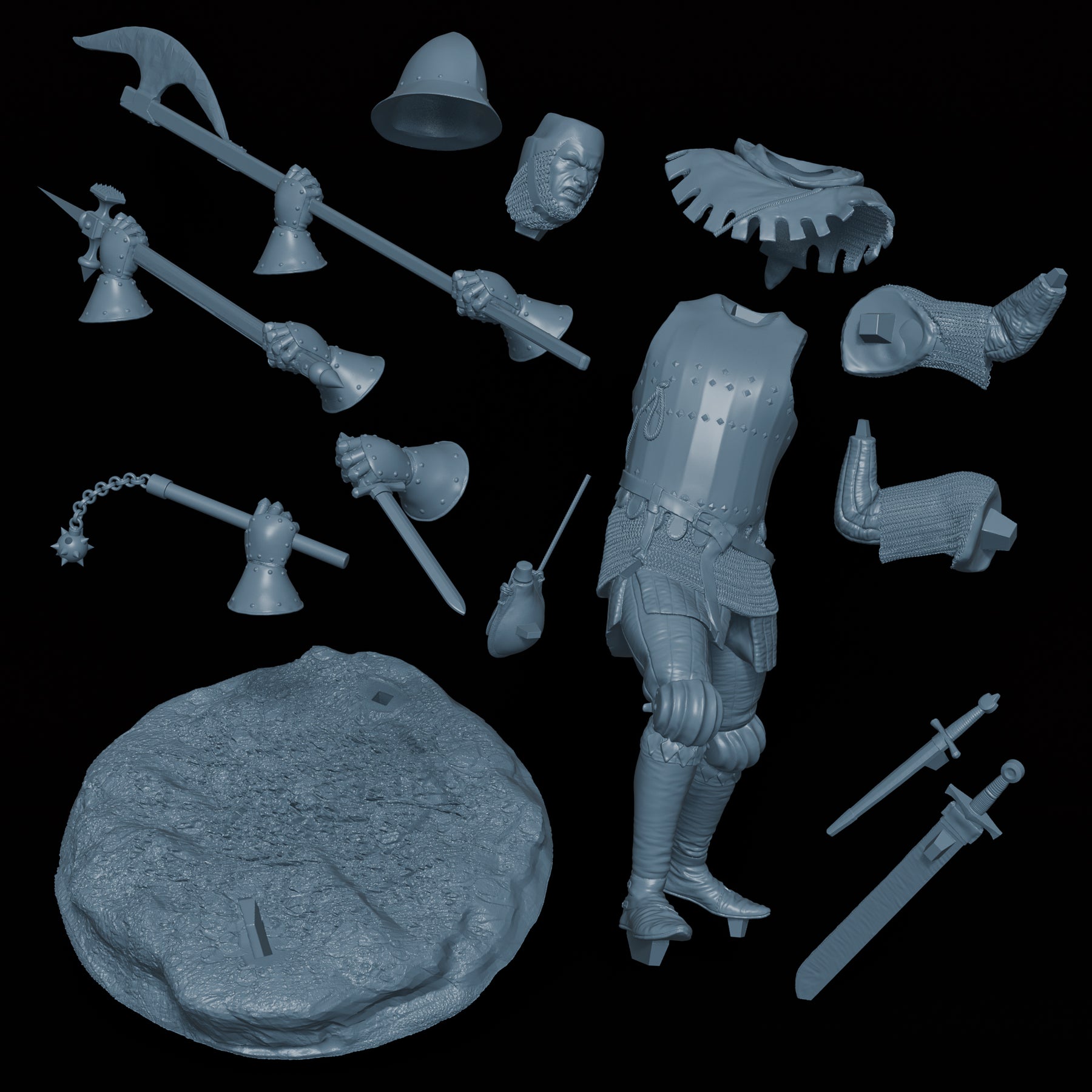 14 parts: Body, Head, Hood, Helmet, x2 Arms, Axe, Hammer, Mace, Dagger in hand, Sword, Dagger, Flask, Base.